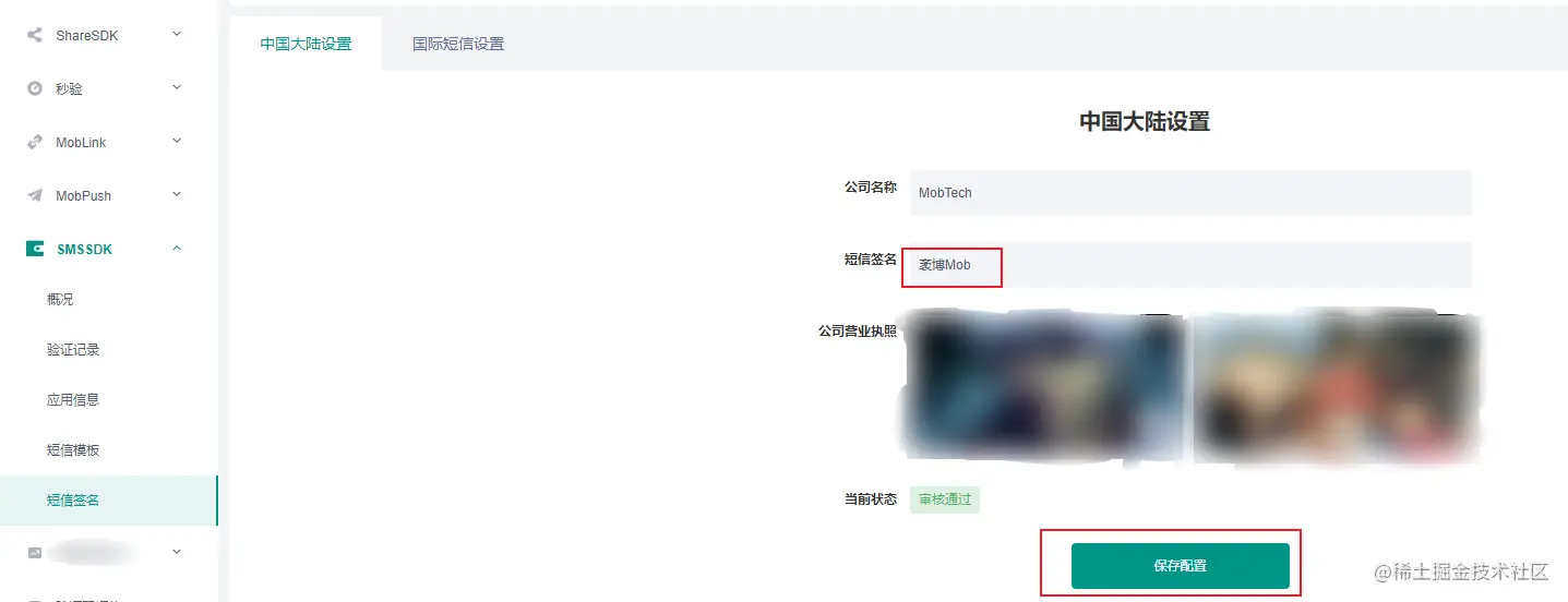 短信签名审核通过后,可在Mob开发者后台应用中进行修改:更改“短信签名”内容后,并上传对应材料,点击”保存配置“即可重新申请短信签名