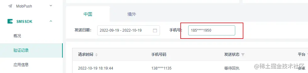 可在Mob开发者后台应用中“SMSSDK”的“验证记录”模块查看短信的验证情况