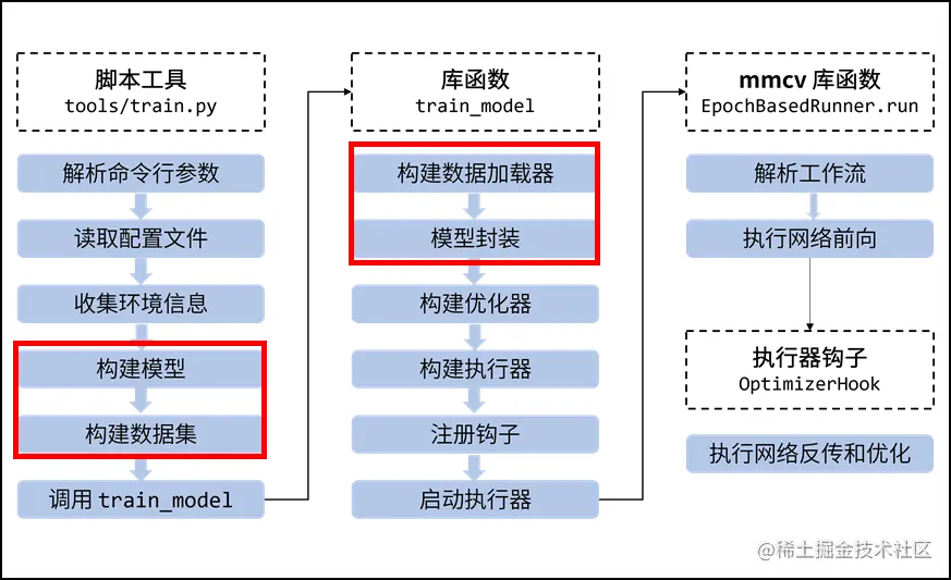 在 MMTracking 原有的架构设计中,对于一个典型的模型训练过程,我们可以发现各个模块的构建被分散在了脚本、MMTracking 库函数、MMCV 库函数中(如图 1 所示)模型的前向传播,反向更新分散在执行器和钩子中,这对于用户理解训练流程带来了很多困难,用户需要自定义修改时容易找不到位置。