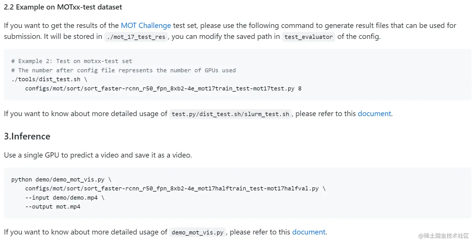 在 MMTracking 0.x 版本中,我们在 quick_run.md 中为每个任务的模型使用方法提供了例子,然而由于每个任务的算法有不同的使用方式,这些例子不能很好地覆盖全部的使用样例,因此在 MMTracking 1.0 版本中,为了让用户能够更加简单快捷地使用 MMTracking 中的任何一个算法,在每一个算法 config 对应的 readme.md 里,我们为每一个算法都提供了更加详细的使用文档,包括训练、测试、推理流程,真正做到了开箱即用。