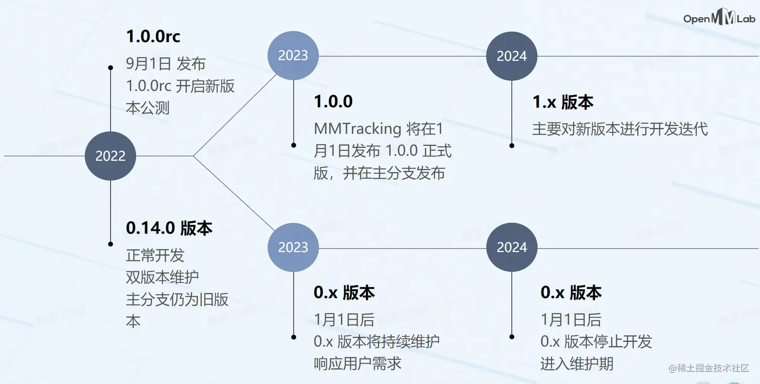 我们将在 2023 年 1 月 1 日正式发布 MMTracking 1.0 版本到主分支,对新版本感兴趣的同学,可以使用 1.x 分支来体验我们的全新版本。我们将在未来保持双分支的同时维护,主要的维护时间线如下所示: