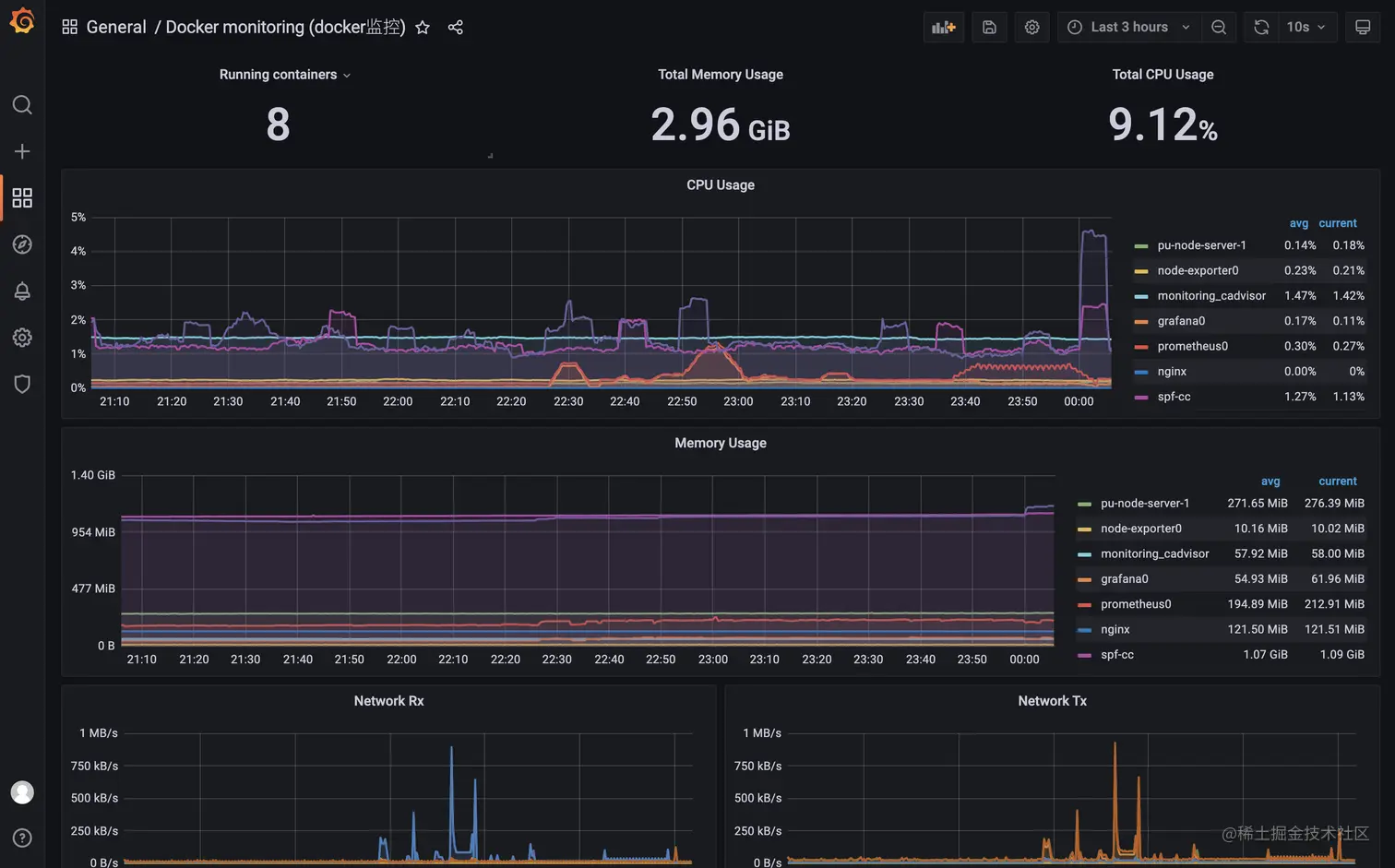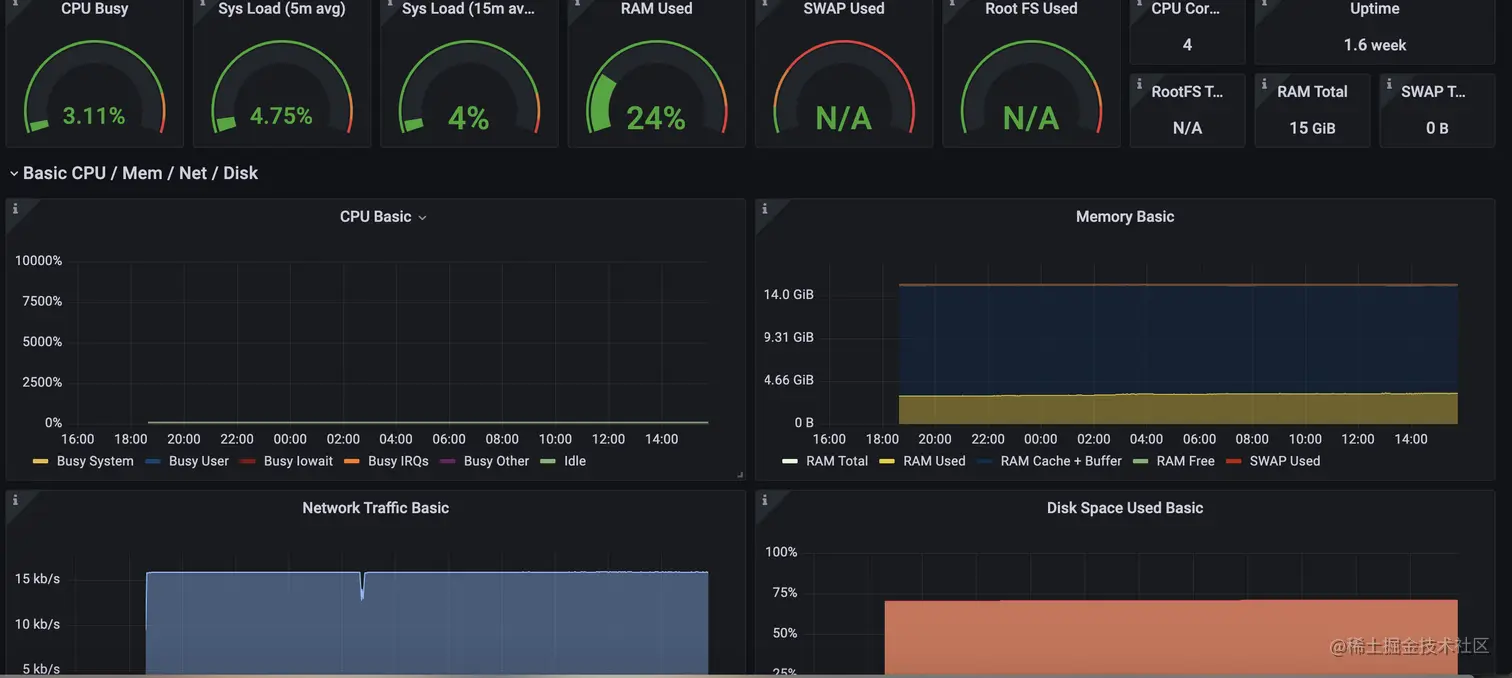 version : "3.7" services : node- exporter : image : prom/node- exporter :latest container_name : "node-exporter0" ports : - "8100:9100" volumes : - "/etc/localtime:/etc/localtime:ro" - "/etc/timezone:/etc/timezone:ro" restart : always prometheus : image : prom/ prometheus :latest container_name : "prometheus0" restart : always ports : - "8101:9090" volumes : - "/etc/localtime:/etc/localtime:ro" - "/etc/timezone:/etc/timezone:ro" - "./prometheus.yml:/etc/prometheus/prometheus.yml" # 前面是普罗米修斯配置文件路径, 默认我放在和docker-compose一个目录 - "./prometheus_data:/prometheus" cadvisor : image : google/ cadvisor :latest container_name : monitoring_cadvisor restart : unless-stopped volumes : - "/:/rootfs:ro" - "/var/run:/var/run:rw" - "/sys:/sys:ro" - "/var/lib/docker/:/var/lib/docker:ro" ports : - "8103:8080" grafana : image : grafana/grafana container_name : "grafana0" ports : - "8102:3000" restart : always volumes : - "/etc/localtime:/etc/localtime:ro" - "/etc/timezone:/etc/timezone:ro" - "./grafana_data:/var/lib/grafana" - "./grafana_log:/var/log/grafana" - "./grafana_data/crypto_data:/crypto_data" # 宿主机的地址是冒号前面的,冒号后面的是容器地址,不可变,这个用来放sqlite数据库的位置。