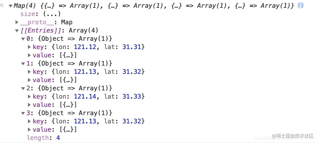 在ES6中可以使用Map进行数据的合并,也是将坐标单独提炼出来,不过是将坐标用作KEY,其他数据用作VALUE。