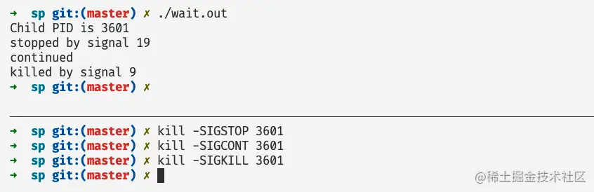 在上图的例子当中,我们在上面的终端先执行 wait.out 程序,然后在下面一个终端我们首先发送一个 SIGSTOP 信号给子进程,先让进程停下来,然后在发送一个 SIGCONT 信号让进程继续执行,最后发送了一个 SIGKILL 信号让子进程退出,可以看到我们上面提到的宏操作都一一生效了,在父进程当中信号和退出状态都一一接受了。