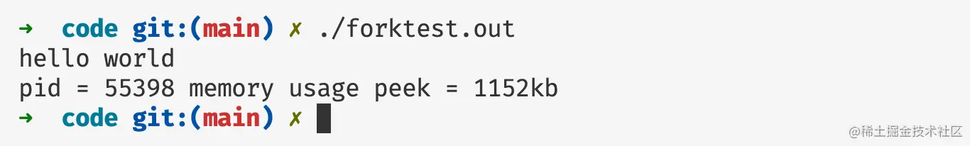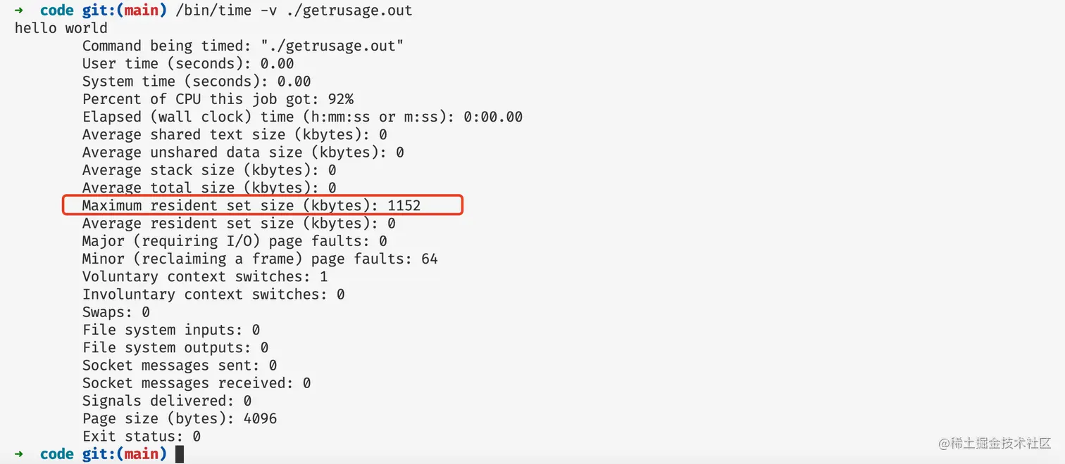 可以看出我们得到了内存使用的峰值,其实我们还可以使用 time 命令去查看一个进程执行时候的这些数据值。