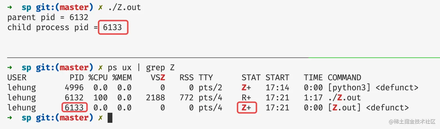 大家可以根据上表当中的内容对应一下程序的状态,就发现子进程目前处于僵尸状态。