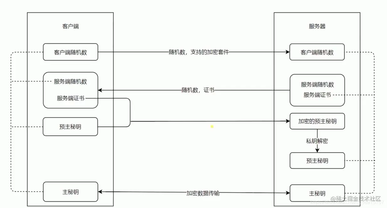3.客户端使用证书(公钥)对一个新的随机数加密,生成预主密钥,然后将预主密钥发送至服务端;