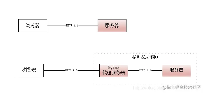 在原服务器的前面设置一层代理服务器,并开启http2,如此以来,浏览器和nginx之间建立http2连接进行通讯,什么分帧传输、信道复用、头部压缩等h2的好处都能使用;请求到达nginx后,nginx执行ALPN策略,判断后台是否支持h2,支持最好,直接原样发送,若不支持,再转为http1.1与后台服务器通讯。看到此处,可能有人会问,这样一来,节省掉的tcp建立连接(http1.1中浏览器与后台服务器)的开销不一样又补回来了吗,并且请求无故多了一次中转,我们大费周章岂不止做了无用功,还延迟了请求的时间线?我不这么认为,因为代理服务器和后台服务在同一局域网内,建立连接的开销比通过外网时的要小太多了,而且他们之间可以同时建立非常多的连接,连接也都可以keep-alive,并且他们之间的数据通信远远高于我们浏览器-服务器。所以总体来看这套方案是把原来“浏览器-服务器的http1.1的请求”拆分为“浏览器-nginx h2请求”和“nginx-服务器 http1.1请求”,而后者的效率是不足以让我们担心的。如下图: