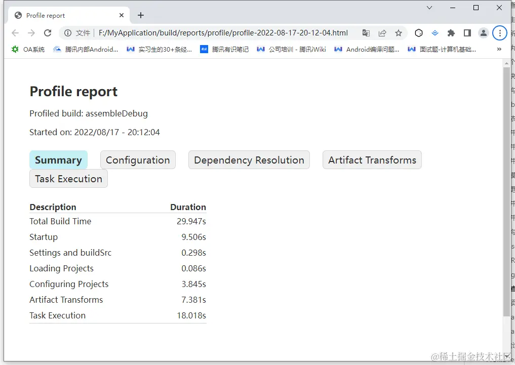 Gradle 构建信息的概览界面,用于 查看 Total Build Time、初始化(包含 Startup、Settings and BuildSrc、Loading Projects 三部分)、配置、任务执行的时间。如下图所示: