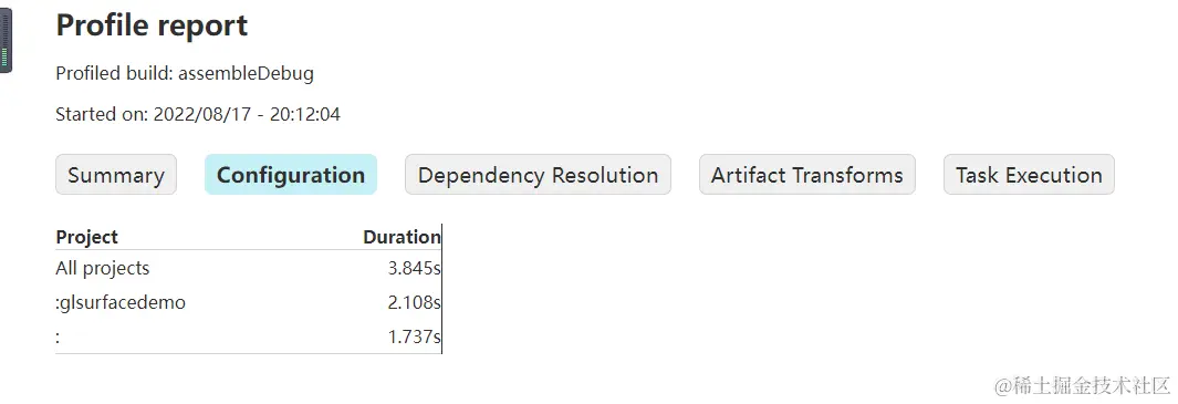 Gradle 配置各个工程所花费的时间,我们可以看到 All projects、app 模块以及其它模块单个的配置时间。如下图所示: