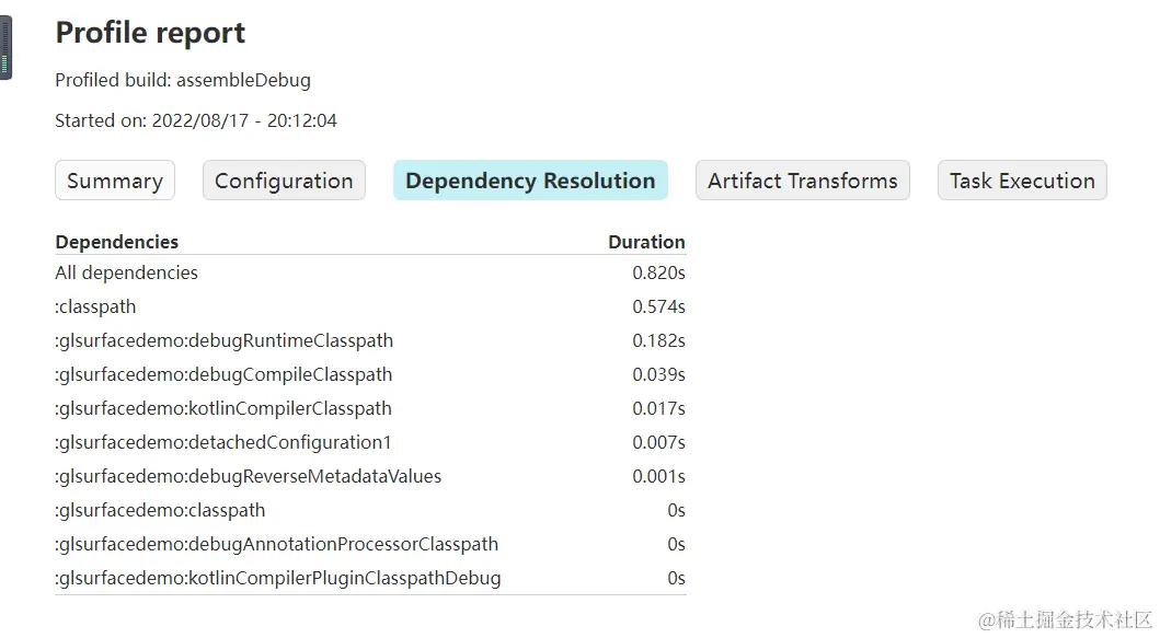 Gradle 在对各个 task 进行依赖关系解析时所花费的时间。如下图所示: