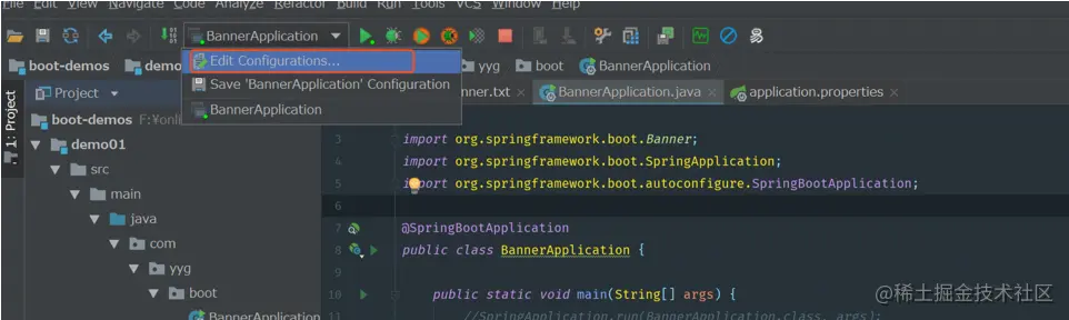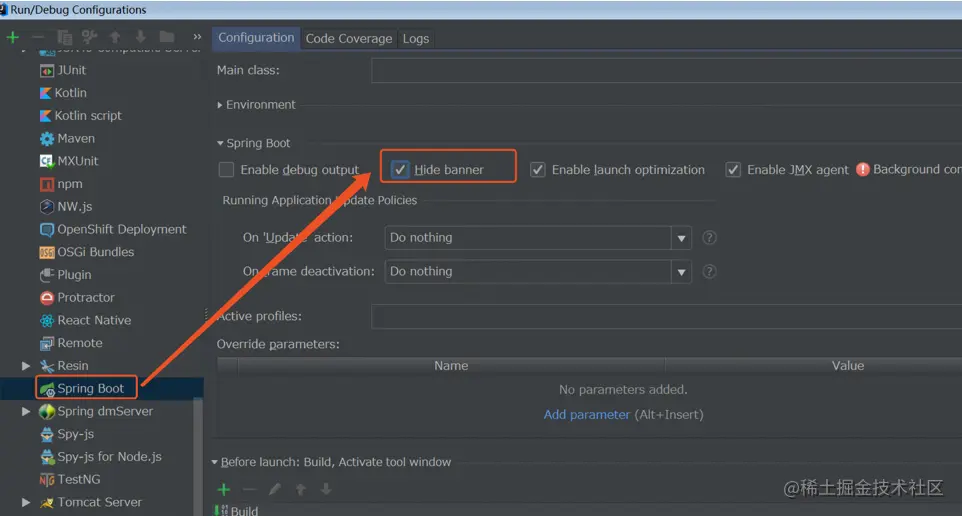 最后还有一种方式,这种方式就不用每次都写代码了,可以通过在每个项目的Edit Configurations中的spring boot选型里,找到Hide Banner,勾选,就可以关闭了!