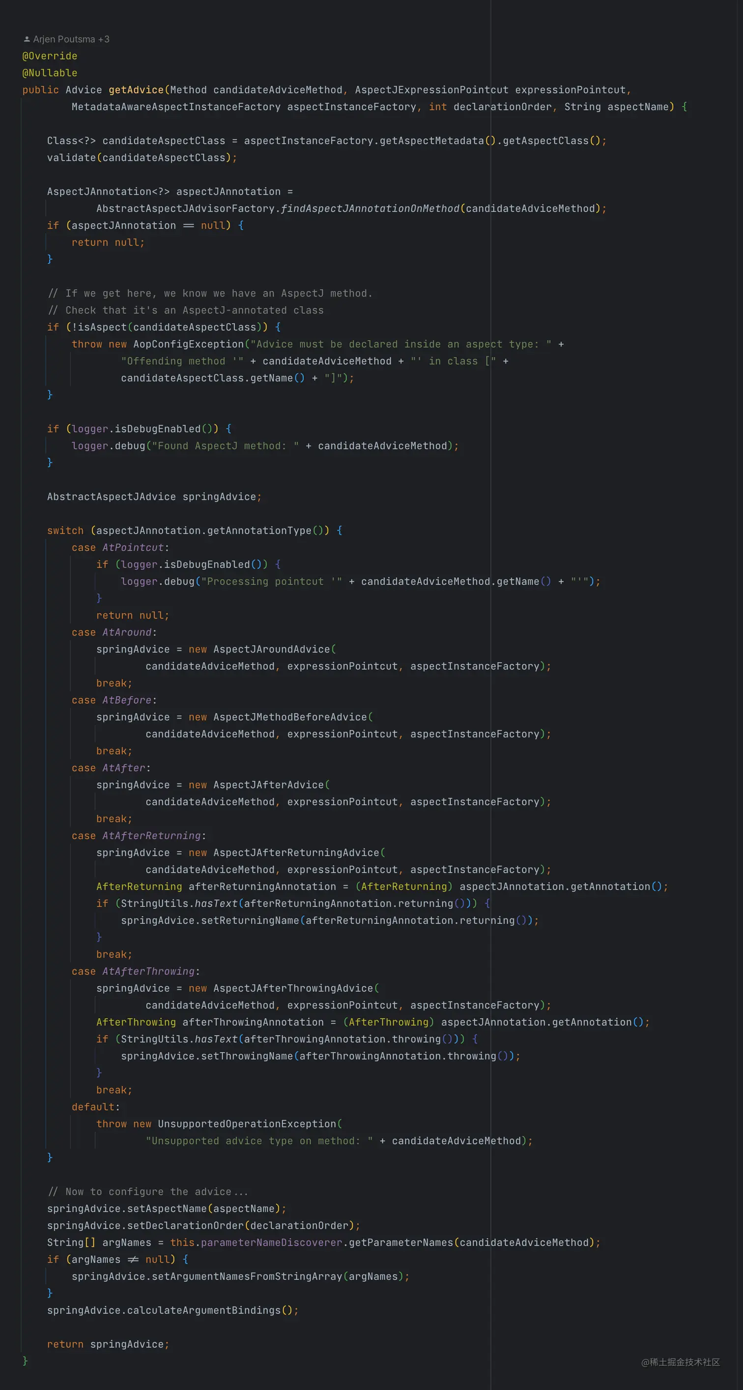 而如果是通过注解的方式配置的切面,Advisor 的类型是 InstantiationModelAwarePointcutAdvisorImpl,其中并没有 Advice 类型的属性,当它的getAdvice方法被调用的时候,才会封装 Advice。