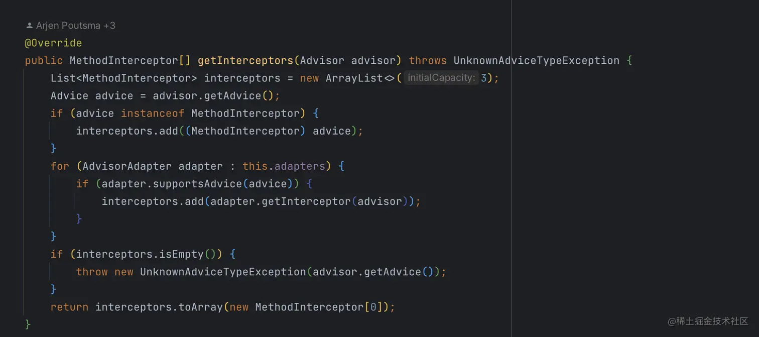 结合getInterceptors方法的返回值类型是MethodInterceptor[],可以知道,实现了 MethodInterceptor 接口的 Advice 可以直接作为返回值数组中的元素,添加到结果数组中,因此,代码中也是这样做的,在if语句块中将其添加到了方法开头声明好的列表interceptors中。