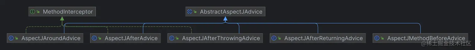 从上面的类关系图中可以看到,AspectJAroundAdvice / AspectJAfterAdvice / AspectJAfterThrowingAdvice 三个类型的 Advice 是实现了 MethodInterceptor 接口的,因此,三个类型中也包含了invoke方法的实现,而其他两个没有。