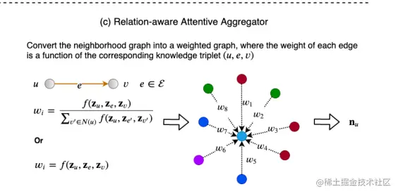 关系感知注意聚合器利用单个函数计算不同关系类型的注意分数,单位为KG,因此可以应用于大规模知识图。同时,它还通过加权与目标节点u相邻的不同节点的贡献来提高深度推荐系统的可解释性。