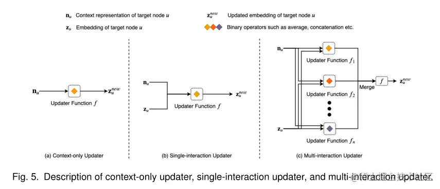 我们将GNN的聚合器分为关系无关聚合器、关系关联子图聚合器和关系关联关注聚合器。另一方面,我们将更新程序分为三类,即仅上下文更新程序、单交互更新程序和多交互更新程序。图4和图5分别描述了各种类型的聚合器和更新器。下面,我们将详细讨论它们。