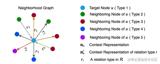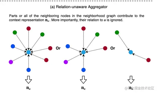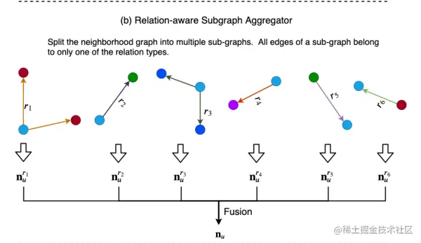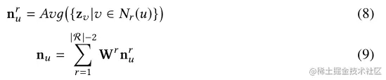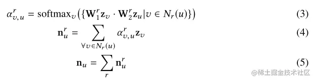 为每种关系构建一种聚合函数,然后将不同关系下的n_u融合到一起,得到最终的上下文表示 n_u