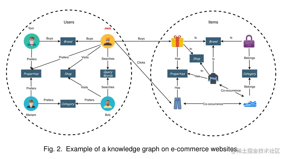 根据杰克的行为,该平台收集了丰富的信息(提交的查询词、点击的物品、参观的商店、首选的房产和品牌),以便将来向他推荐潜在的有趣物品。这种推荐场景也可以在其他网站上看到。一般来说,多种对象和历史用户行为构成了一个知识图。图2显示了电子商务网站上的1、示例。