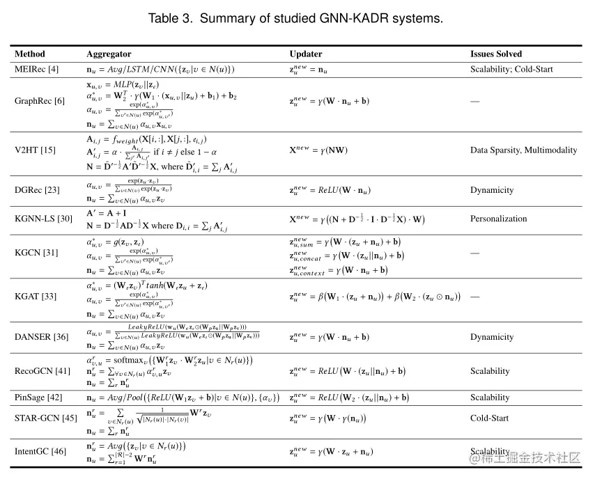 为了消除大规模图的聚类迷你图训练的限制,IntentGC[46]引入了一种特殊的图神经网络,它用矢量聚合器和矢量更新器取代GNNs中的常规聚合器和更新器。其关键思想是用多个小矩阵乘积的总和代替巨大权重矩阵和巨大特征向量(由多个向量串联而成)之间昂贵的矩阵乘法,从而避免不必要的特征交互。详细如表3所示。