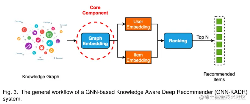 基于GNN的知识感知深度推荐(GNN-KADR)系统的一般工作流程如图3所示。GNN-KADR的图嵌入模块首先学习为每个图节点(包括用户和项目节点)生成一个嵌入,该嵌入对从输入知识图中提取的信息进行编码。接下来,对于给定用户,排名模块根据其对应的嵌入计算该用户与每个候选项之间的匹配分数。具有前N个匹配分数(或匹配分数高于用户指定阈值)的项目将链接(推荐)到此用户。