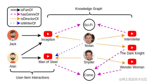 图1:YouTube上用户项目交互和知识图的插图,其中包含用户、电影、导演和类型作为对象;喜欢、分类、指导和写作作为客体关系