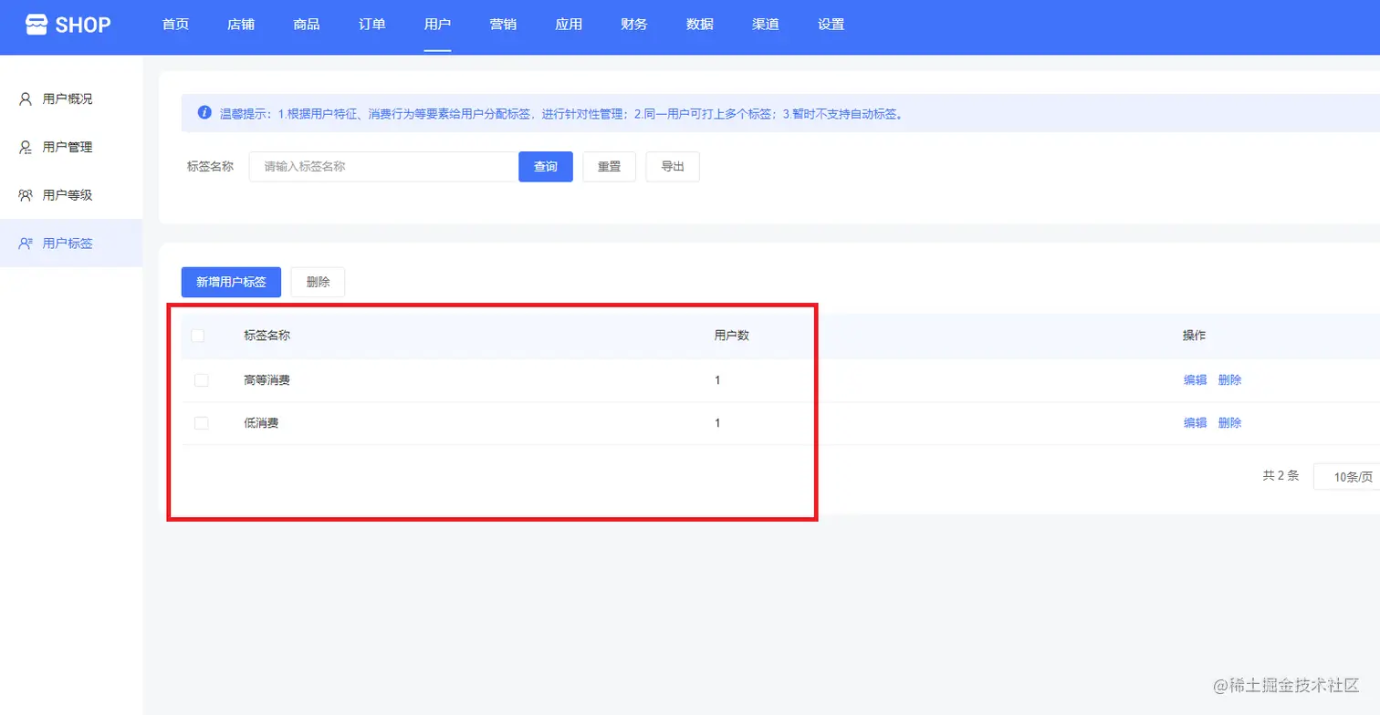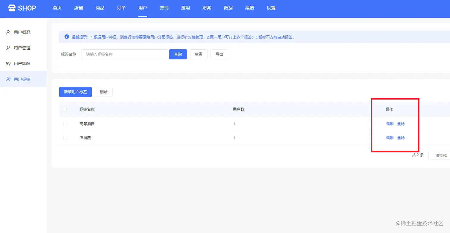 用户标签,根据用户特征、消费行为等要素给用户分配标签,进行针对性管理,同一用户可打上多个标签,暂时不支持自动标签。