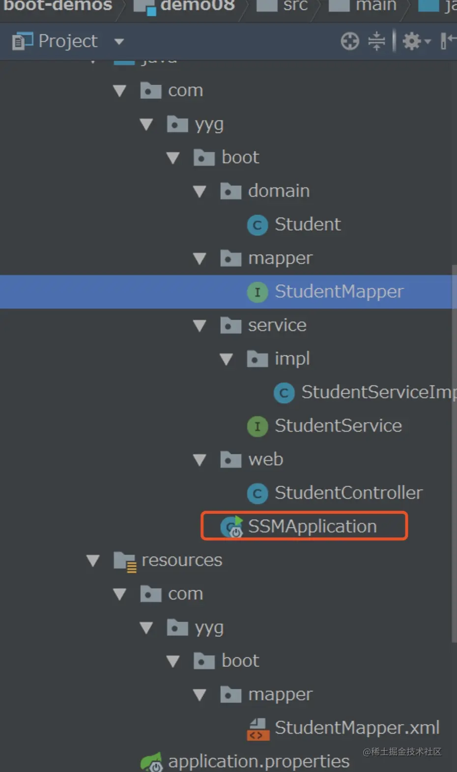 最后我们在“com.yyg.boot”包的根目录下,创建一个程序入口类SSMApplication!这里一定要注意在该类上 配置@MapperScan注解,扫描mapper接口文件所在包!