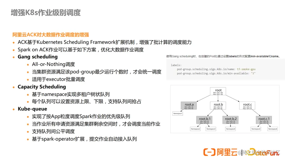 - 基于 NameSpace 实现多租户树状队列,队列可以设置资源上下限,支持队列间抢占资源。