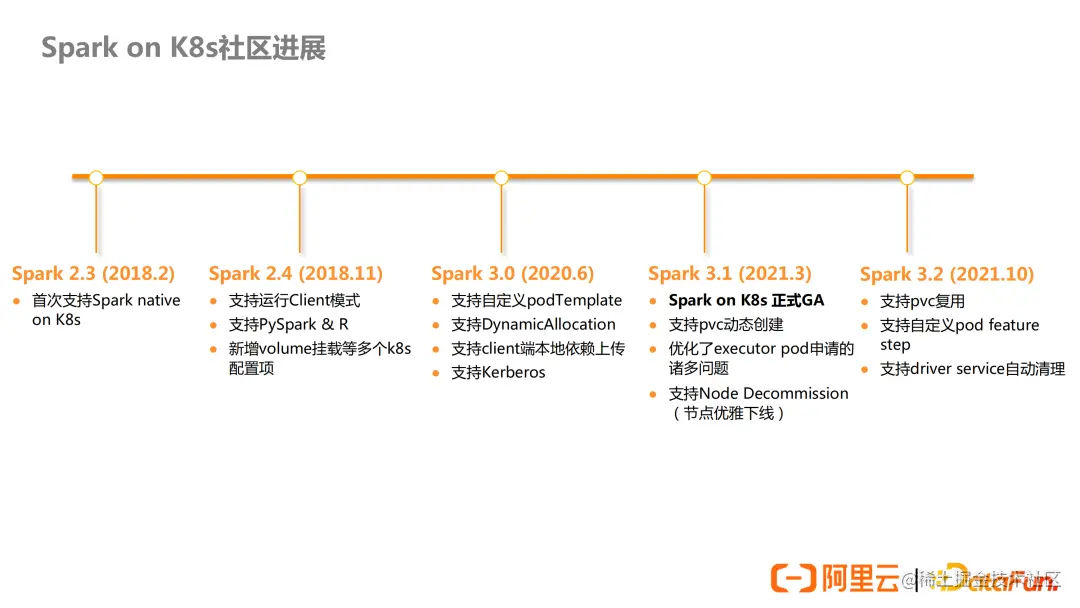 Spark2.4 做了少量的特性优化,真正完善了这个功能是在 Spark3 版本,尤其是 Spark3.1 正式可用(GA)。当前 Spark on K8s 方向热度很高,所以如果感兴趣的同学建议直接升级到 Spark3.1 来尝试这个部署方式。