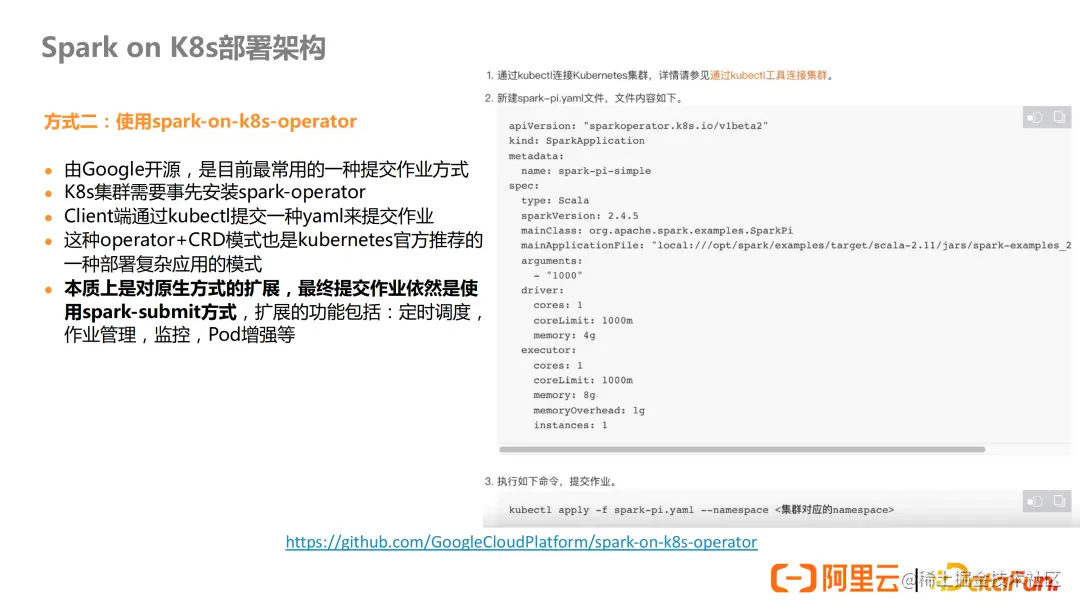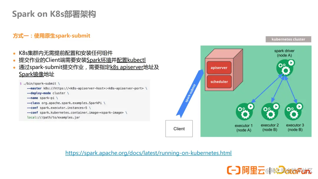Spark2.3,社区首次发布支持了原生的 Spark on K8s,全是第一次官方支持这样的部署方式。