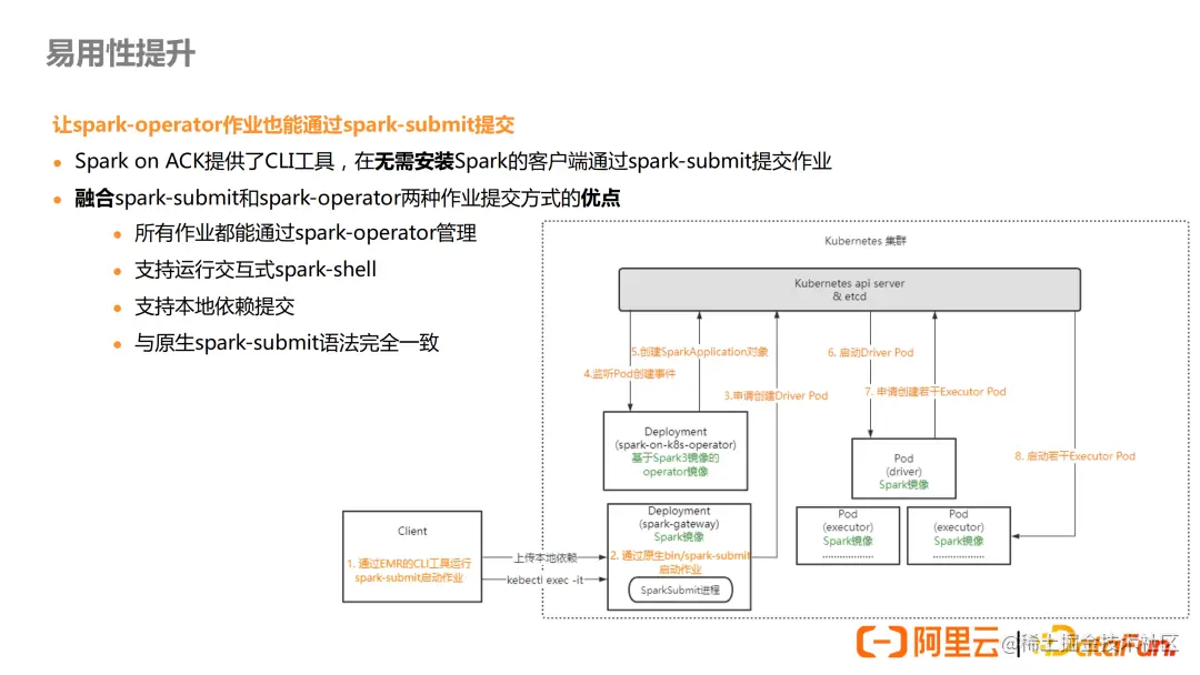 Spark on ACK 提供了一个 CLI 工具,可以直接以 spark-submit 语法来提交 spark 作业,同时也会记录到 spark-operator 里面来管理。之前我们提到了 2 种提交作业方式的优劣,spark-operator 具备比较好的作业管理能力,但是提交作业不兼容老的命令语法,也无法跑交互式 shell,从老集群迁移的用户改动比较麻烦,因此利用我们这种工具,可以同时享受 2 种提交方式的优点,对用户的易用性来说是个比较大的提升。