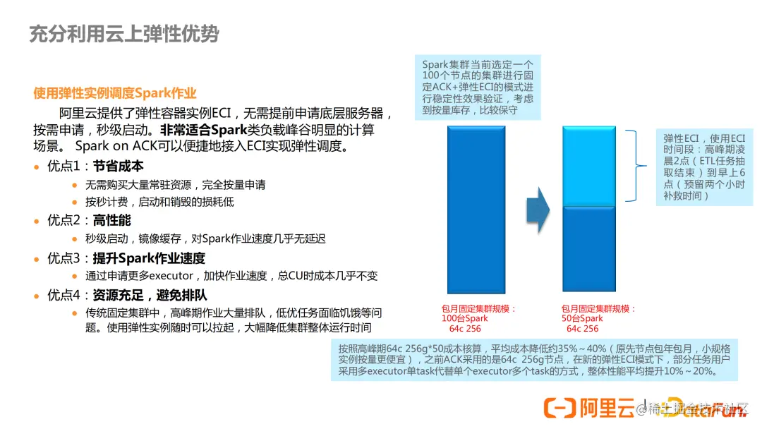 Spark 在云上最大的优势就是更好的弹性,在阿里云的 ACK 的环境中,提供了一个弹性容器实例 ECI 的产品,有了 ECI 意味着,我们申请 pod 时不再是占用自己的机器节点的资源了,而是完全利用云上资源来创建 pod,而且可以做到快速拉起,秒级付费。利用 ECI 来跑 spark 作业我认为是非常划算的,因为通常大家用 spark 作业跑批处理任务,凌晨高峰,白天可能只有少量查询,这种峰谷明显的特点搭配快速弹性和按量付费是很适合的,外加 ECI 可以使用 spot 抢占式实例,有 1 个小时的保护期,并结合 Spark 的 Node decommissioning 特性,可以节省很多成本。