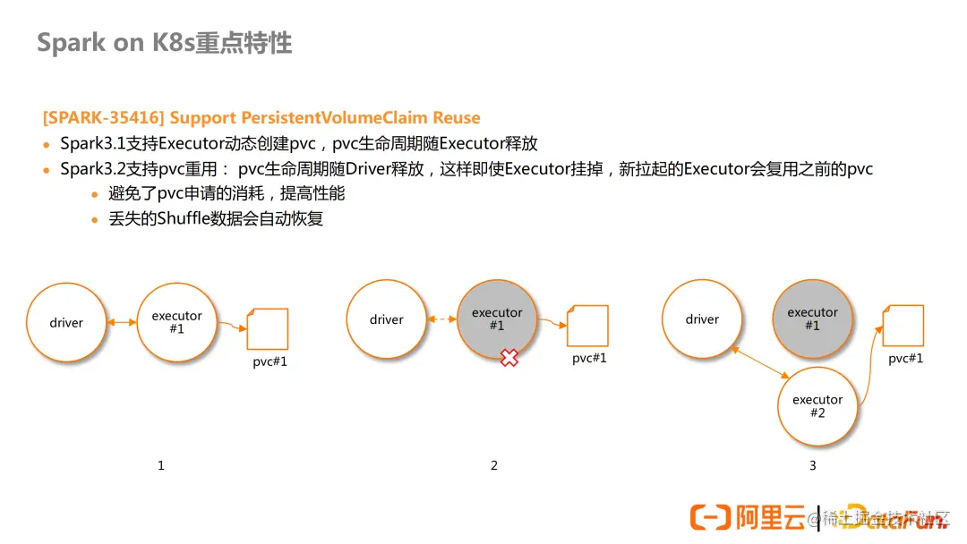 PersisentVolumnClaim(简称 pvc),是 K8s 的存储声明,每个 Pod 都可以显式地申请挂载。Spark3.1 支持动态创建 pvc,意味着不需要提前声明申请,可以随着执行动态的申请挂载资源。但是这个时候 pvc 的生命周期伴随着 Executor,如果出现上述的抢占式被迫关闭的情况,同样会出现保存在 pvc 上面的数据丢失重算的问题。所以在 Spark3.2 中,支持了 pvc 重新利用,它的生命周期伴随 Driver,避免了重新申请和计算,保障整体的效率。
