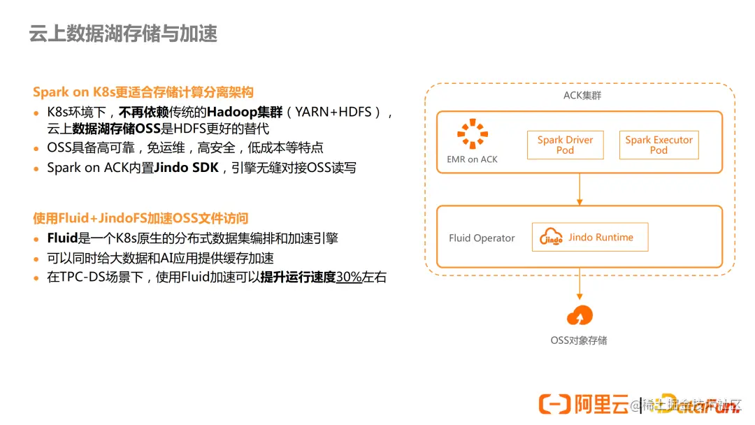 - 在 K8s 环境下,相比于传统的 Hadoop 集群,使用数据湖存储 OSS 更贴合存算分离的架构。Spark on ACK 内置 Jindo SDK,无缝对接 OSS。