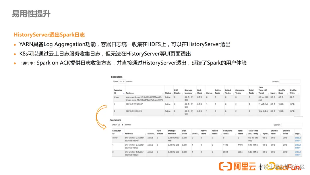 在日志收集这一点,Spark on ACK 提供日志收集方案,并通过 HistoryServer 让用户可以像 Spark on YARN 一样在界面上查看。