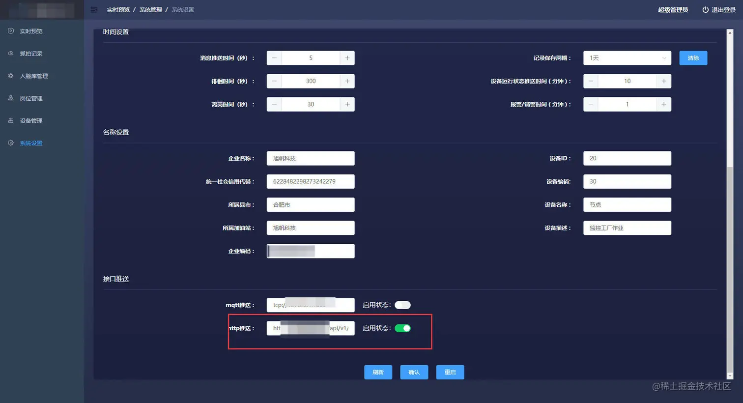 1)首先,进入到智能分析网关的web页面,点击系统设置,修改接口推送下的http推送的参数,然后重启设备;