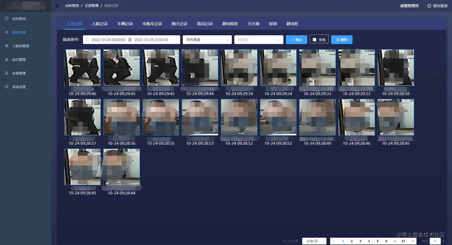 7)完成以上步骤后,可以在抓拍记录中查看到抓拍及经AI识别后的异常告警信息,如区域入侵、人体检测、车辆违停等。