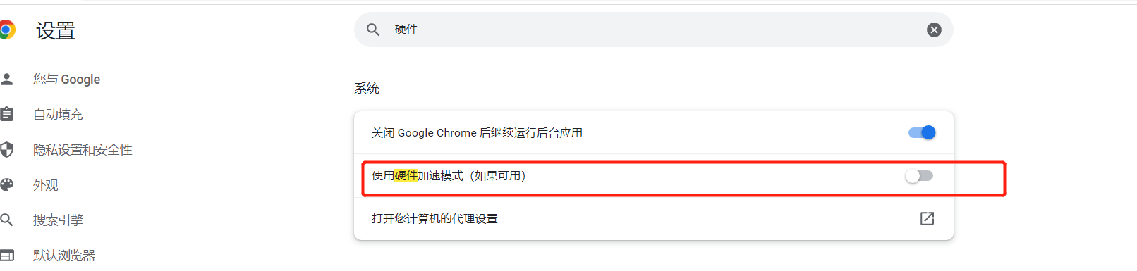 3、只需通过浏览器设置查找到硬件加速,将硬件加速模式关闭,再重启浏览器即可解决;