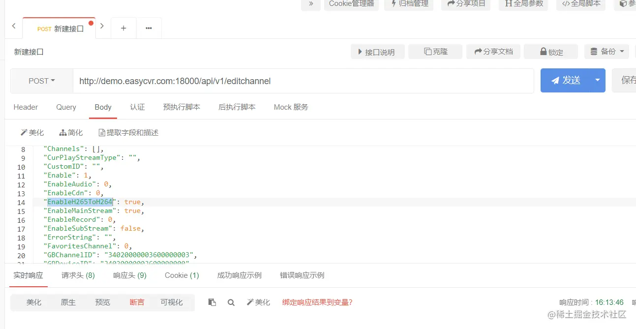 3、找到需要配置转码的通道后调用post接口修改通道配置,将EnableH265ToH264参数调整成true后即可配置成功了。