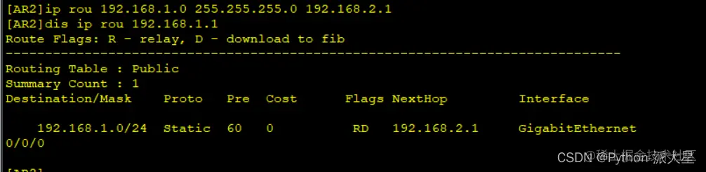 去另一个路由器配置路由表,查看去192.168.1.1的路由表,发现存在了。
