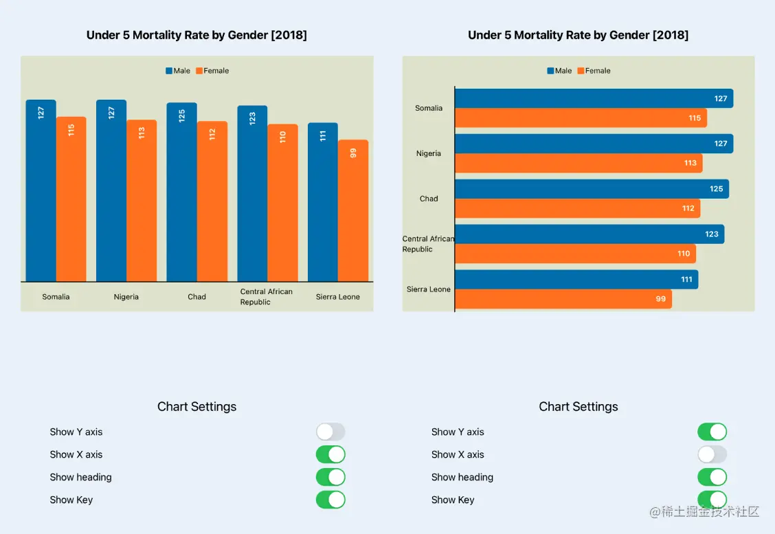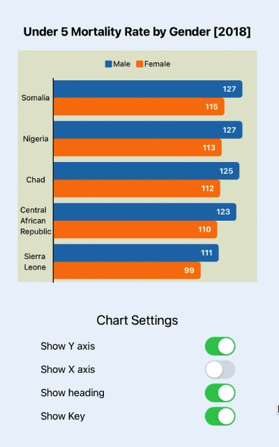 一个 iPad 模拟器被用来比较垂直和水平条形图的使用,以显示2018年五岁以下儿童死亡率最高的国家。柱状图的多数据功能被用来比较男孩和女孩的死亡率。