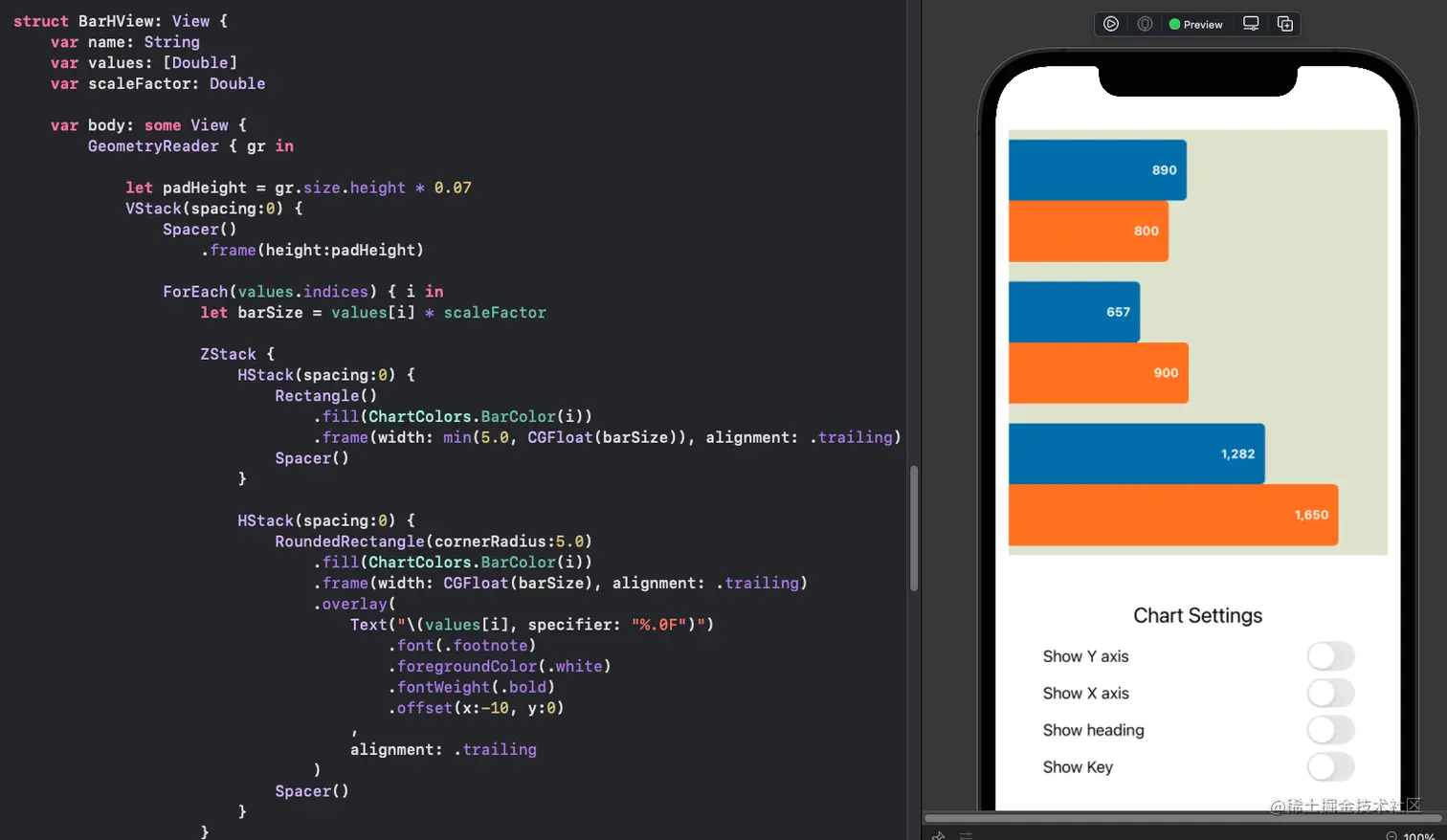 我们创建了一个 YaxisHView 视图,用于在水平条形图上显示 Y 轴和条形图中的数据类别。Y轴标签的 Swift 代码与垂直条形图的X轴代码相似,宽度设置与高度设置互换。两种图表类型的y轴线的代码都是一样的。