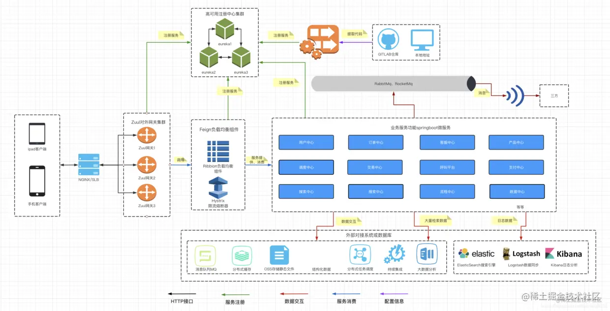 我感觉微服务不是一个架构,而是像一个生态,应用与应用之间互相独立,却又彼此依赖。通过 DDD 的模型来设计一个地图,把合适的代码放到合适的地方去。实现微服务涉及的工具太多,以下我采用spring生态来描述整个微服务生态架构,小伙伴可以体会一下。来个宏观图体会一下微服务是啥样的: