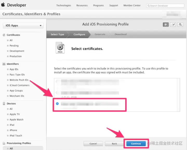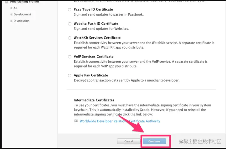 4、选择你刚创建的发布证书(或者生成p12文件的那个发布证书),点击Continue