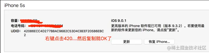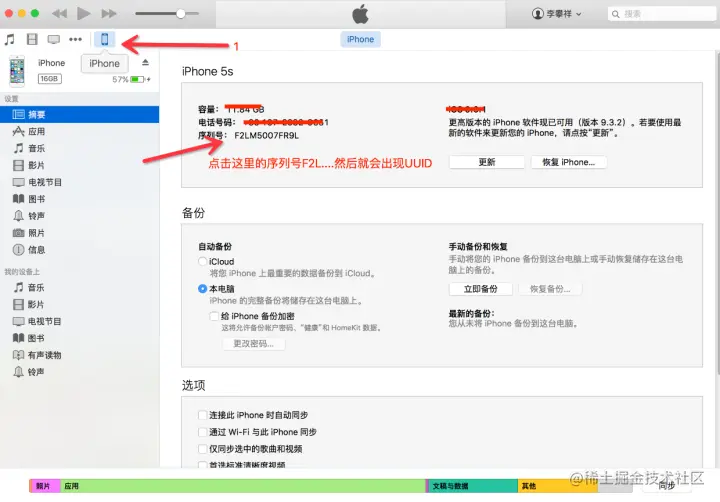 2、获取UUID(这里随便提供一种方法获取UUID) 将iPhone手机插入到电脑上 ,打开iTunes,然后按如图操作