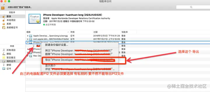 我们的每一个证书都可以生成一个.p12文件,这个文件是一个加密的文件,只要知道其密码,就可以供给所有的mac设备使用,使设备不需要在苹果开发者网站重新申请开发和发布证书,就能使用。