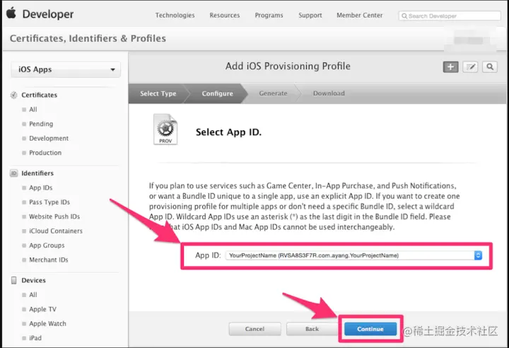 3、在App ID 这个选项栏里面找到你刚刚创建的:App IDs(Bundle ID) 类型的套装,点击Continue