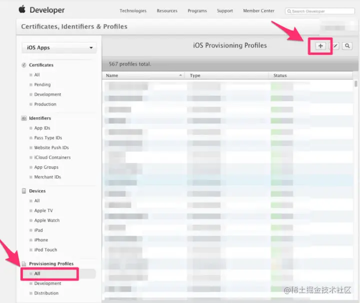 1、找到Provisioning Profiles ,点击All,然后点击右上角 + 号