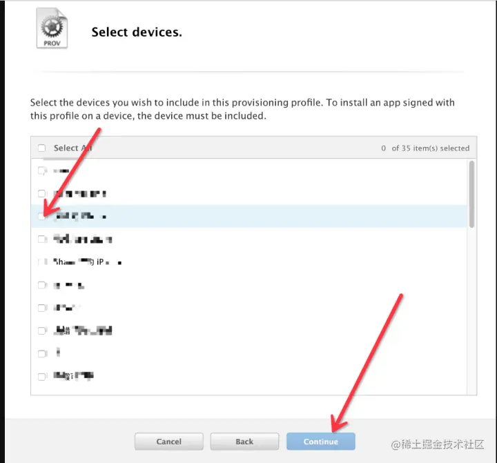 注意:wildCard格式的证书没有推送,PassCard等服务的应用,慎重选择。因为PP证书的开发者证书需要真机调试,所以我们需要绑定真机,这里因为之前添加过一些设备,所以这里就可以直接全选添加,如果没有的话,需要将真机的udid复制出来在此添加。在发布的PP文件中,是没有这一步的。